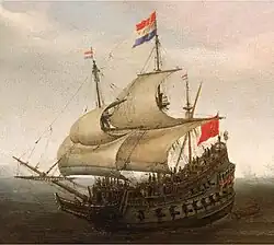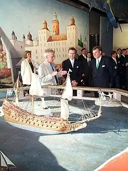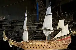 Master Henrik and Arendt de Groote began buying the raw materials needed for the first ships in 1625, purchasing timber from individual estates in Sweden as well as buying rough-sawn planking in Riga, Königsberg (modern Kaliningrad), and Amsterdam. As they prepared to begin the first of the new ships in the autumn of 1625, Henrik corresponded with the king through Vice Admiral Klas Fleming about which ship to build first. The loss of ten ships in the Bay of Riga led the king to propose building two ships of a new, medium size as a quick compromise, and he sent a specification for this, a ship which would be 120 feet (37 m) long on the keel. Henrik declined, since he had already cut the timber for a large and a small ship. He laid the keel for a larger ship in late February or early March 1626.[20] Master Henrik never saw Vasa completed; he fell ill in late 1625, and by the summer of 1626 he had handed over supervision of the work in the yard to another Dutch shipwright, Henrik "Hein" Jacobsson. He died in the spring of 1627, probably about the same time as the ship was launched.[21] After launching, work continued on finishing the upper deck, the sterncastle, the beakhead and the rigging. Sweden had still not developed a sizeable sailcloth industry, and material had to be ordered from abroad. In the contract for the maintenance of rigging, French sailcloth was specified, but the cloth for the sails of Vasa most likely came from Holland.[22] The sails were made mostly of hemp and partly of flax. The rigging was made entirely of hemp imported from Latvia through Riga. The king visited the shipyard in January 1628 and made what was probably his only visit aboard the ship.[23]