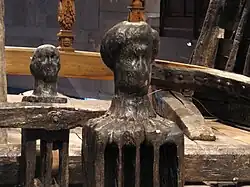The artistic quality of the sculptures varies considerably, and about four distinct styles can be identified. The only artist who has been positively associated with various sculptures is Mårten Redtmer, whose style has been described as "powerful, lively and naturalistic".[70] He was responsible for a considerable number of the sculptures. These include some of the most important and prestigious pieces: the figurehead lion, the royal coat of arms, and the sculpture of the king at the top of the stern. Two of the other styles are described as "elegant ... a little stereotyped and manneristic", and of a "heavy, leisurely but nevertheless rich and lively style", respectively. The fourth and last style, deemed clearly inferior to the other three, is described as "stiff and ungainly"[71] and was done by other carvers, perhaps even apprentices, of lesser skill.[72]
