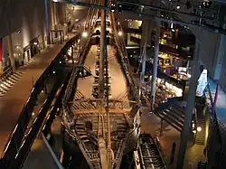 Vasa had three masts: a foremast towards the bow of the ship, a mainmast near the middle and a mizzen mast towards the aft of the ship. The fore- and mainmasts were built in three sections: a lower mast that was stepped on the stem and keel at the bottom of the ship's hull and passed through each of the decks; a topmast that was attached to the lower section; and a topgallant mast at the top. The topmasts and topgallants were salvaged soon after the sinking, while most of the lower sections of the main and foremasts largely survived to be salvaged in modern times. The mizzen mast consisted of only two sections: a mizzen, which was stepped on the upper gundeck, followed by a mizzen topmast.[38] The bowsprit was stepped against the front of the lower foremast through the bowsprit bitts, a heavy timber frame located on the upper gundeck. The bowsprit served as a point of attachment for several of the major stays that held up much of the standing rig. At the outer end of the bowsprit there was a spritsail topmast with a mast head to carry a flagstaff.[39]
