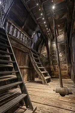 The lower foremast was made from a single pine tree with additional material to make the cheeks and the hounds that were used to attach the stays.[40] The lower mainmast was assembled as a "made mast" from a number of pieces of timber that reinforced a central core, rather than from a single tree.[41] A single-tree mast was the preferred choice at the time and was much stronger structurally. The shipyard in Stockholm had at least indirect access to timber from western Sweden at the time. "Gothenburg masts" were considered among the best in Europe, but this source was not fully utilized by the Swedish navy until later in the 17th century. The made mast used for Vasa was most likely supplied by Amsterdam-based merchants[42] who dominated the European timber market at the time.[43]