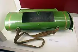 Vascula are cylinders typically made from tinned and sometimes lacquered iron, though wooden examples are known. The box was carried horizontally on a strap so that plant specimens lie flat and lined with moistened cloth.[1] Traditionally, British and American vascula were somewhat flat and valise-like with a single room, while continental examples were more cylindrical and often longer, sometimes with two separate compartments.[2] Access to the interior is through one (sometimes two) large lids in the side, allowing plants to be put in and taken out without bending or distorting them unnecessarily. This is particularly important with wildflowers, which are often fragile.