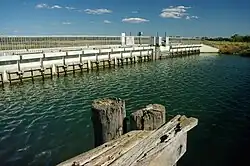 Like the Vasse floodgates, the Wonnerup floodgates were built by the Public Works Department in 1907. The site chosen was near the Forest Beach Road bridge and like the Vasse floodgates, they were refurbished in 1927, 1942, 1991 and replaced in 2004.[3] The new site was 20 m (66 ft) upstream from the original gates. Once the new gates were operational, the old gates were removed and destroyed, though the abutments were left in place, with the south abutment having a high degree of authenticity from the original structure.[1]