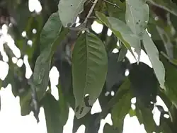 Leaves are simple, alternate; stipules small, fugacious; petiole 20โ50 mm long, stout, glabrous; lamina 9-25 x 3โ11 cm, ovate or oblong, base obtuse or broadly cuneate, apex obtusely acute, margin entire, coriaceous, glabrous; lateral nerves 10-14 pairs, parallel, prominent, intercostae scalariform, prominent.[3]