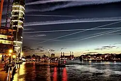 ![]() River Thames looking upstream from Vauxhall Bridge showing (left) St George Wharf Tower and (centre) Battersea Power Station, and the shorelines, left to right, of Vauxhall, Nine Elms, Battersea and Pimlico | |