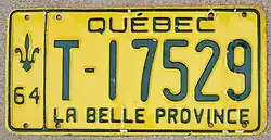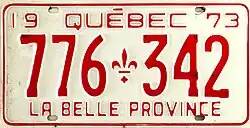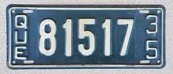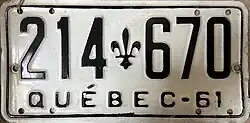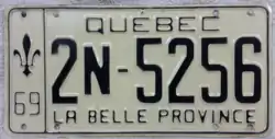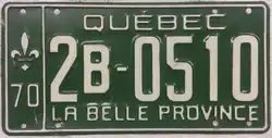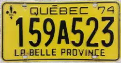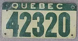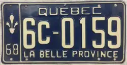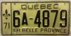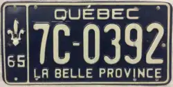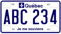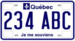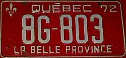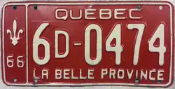 The Canadian province of Quebec first required its residents to register their motor vehicles in 1906. Registrants provided their own licence plates for display until 1908, when the province began to issue plates.[2] Plates are currently issued by the Société de l'assurance automobile du Québec (Quebec Automobile Insurance Corporation).