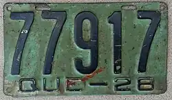 1928 | Embossed black serial on light green plate; "QUE–28" at bottom | none | 123456 | 10001 to approximately 108000 | |