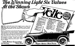 In 1914, a six-cylinder Continental joined electric start and Bosch dual ignition.[3] Velie production averaged about 5,000 cars a year, peaking at 9,000 in 1920.[3] Beginning in 1916, all Velies were powered by six-cylinder engines;[3] in 1926 a straight eight Lycoming engine was also offered. Velie chose to focus production solely on its six-cylinder OHV Model 58 in 1922.[3] In 1924, Velie began installing Westinghouse electric ignitions in their cars. Added to this in 1925 were four-wheel hydraulic brakes and balloon tires,[3] both still novel.[3]