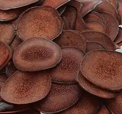 In Asia, velvet antler is dried and sold as slices, or as a powder which may be boiled in water, usually with other herbs and ingredients, and consumed as a soup.[7] In the traditional commercial trade of Korea and China, whole stick antler velvet is divided into three sections based upon their supposed properties. Although there is an absence of uniform standardization, these sections are known as the wax piece (uppers or tips), the blood piece (middles), and the bone piece (bottoms): the wax piece may be marketed as a growth tonic for children, the blood piece supposedly for joint and bone effects, and the bone piece supposedly for calcium deficiency and geriatric needs.[2][5][10] Early commercial activity in Russia between the 1930s and 1980s led to the production of an alcohol extract from deer antler velvet marketed under the Russian drug trade name Pantocrin (also pantocrine or pantokrin).[11][12]