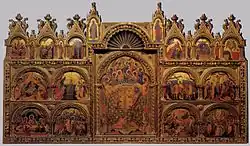 Paolo Veneziano, probably active between about 1320 and 1360, is the first major figure we can name, and "the founder of the Venetian school". He seems to have introduced the "composite altarpiece" of many small scenes within an elaborate gilded wooden frame, which remained dominant in churches for two centuries. These transferred to painting the form of the huge, jewel-encrusted and very famous Pala d'Oro behind the main altar in San Marco, the enamel panels for which had been made in, and later looted from, Constantinople for successive doges.[16] In fact, one of Veneziano's commissions was to paint "weekday" panels to fit over the Pala, which was only revealed for feast-days. His style shows no influence from Giotto, active a generation earlier.[17]