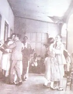 In Caracas, the term merengue rucaneao designated a way of dancing with couples holding and often featuring exaggerated hip movements (which added to the craze and subsequent controversy). Dances were paid affairs, with popular prices being “a locha” (12+1⁄2 cents) or “a medio” (25 cents) in dance halls known then as mabiles. Live accompaniment consisted of four solo instruments: trumpet, trombone, saxophone and clarinet and rhythm instruments such as the cuatro, bass and percussion (which, depending on the size of the ensemble, could be as simple as a scraper, or incorporate maracas and even a snare drum) . Travelling groups known as cañoneros walked around the neighborhoods staging impromptu performances for tips. The name "cañoneros" comes from their marketing approach, which included firing a carbide charge from a blank cannon made of a thick, hollowed-out bamboo cane.