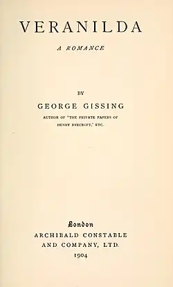 Veranilda: A Romance is a posthumous novel by English author George Gissing. The book was left incomplete at the time of Gissing's death (28 December 1903) and it was first published in 1904 by Archibald Constable and Company.