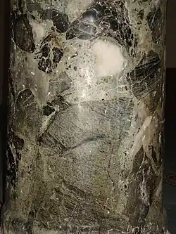 Verd antique (obsolete French, from Italian, verde antico, "ancient green"), also called verde antique, marmor thessalicum, or Ophite, is a serpentinite breccia[1] popular since ancient times as a decorative facing stone. It is a dark, dull green, white-mottled (or white-veined) serpentine, mixed with calcite, dolomite, or magnesite, which takes a high polish.[2] The term verd antique has been documented in English texts as early as 1745.