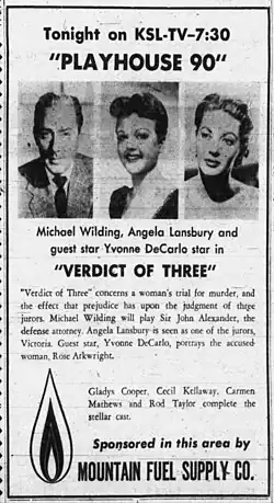 "Verdict of Three" was an American television play broadcast on April 24, 1958, as 31st episode of the second season of the CBS television series Playhouse 90. James P. Cavanagh wrote the teleplay loosely based on the 1940 novel, Verdict of Twelve by Raymond Postgate. Buzz Kulik directed and Martin Manulis produced. Michael Wilding, Angela Lansbury, and Yvonne De Carlo starred.[1]