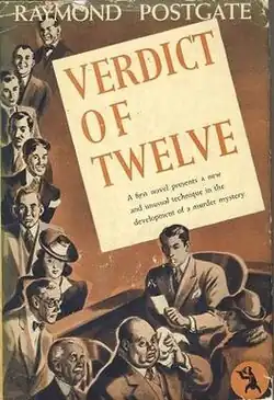 Verdict of Twelve is a novel by Raymond Postgate first published in 1940 about a trial by jury seen through the eyes of each of the twelve jurors as they listen to the evidence and try to reach a unanimous verdict of either "Guilty" or "Not guilty". Verdict of Twelve is set in England in the late 1930s (Hitler, Nazism and in particular anti-Semitism are referred to several times). Up to the final pages of the novel, till after the trial is over, the reader does not know if the defendant—a middle-aged woman charged with murder—is innocent or not.