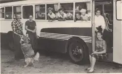 Photograph of the Vernon Johnson Family with the 1947 Ford bus that they drove around the world, 1960–1961.