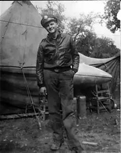 Photograph of 1st Lieut. Vernon O. Johnson at Foggia Air Force Complex in Italy, October 1944. Army Air Corps photograph