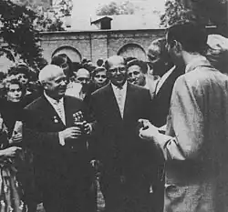 By the mid-1950s, anti-Communist influence of Senator Joe McCarthy, aided by the House Un-American Activities Committee led to the establishment of the Doolittle Report. In September 1959, when Russian Premier Nikita Khrushchev was denied permission to visit Disneyland during his U.S. tour he was angry. Headlines read "K Blows Top".[7] On the train ride from Los Angeles to San Francisco, Khrushchev was not interested in visiting with other dignitaries. Public relations had a planned stop for him to shake hands with the mayor in Santa Barbara. Johnson, his wife, and eight children were at the train station to greet the world leader. Khrushchev looked out the train window, had eye contact with Johnson then stood, walked to the front of the train, disembarked and shook hands with the mayor, then walked 40–50 yards back to shake Johnson's hand and said (via interpreter), "You have a nice face".[8][9][10] Johnson replied that he would take his family to Russia; Khrushchev said Russia would welcome them. The Times of London headline reported "All Change In Santa Barbara".[11]