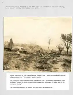 During the mission, engine fire caused them to return to Foggia. Unable to land at Foggia, they were diverted to Iesi which resulted in the plane crashing and exploding. Seven crewmen died, and Johnson suffered major injury including dislocated hips, broken ankles and a broken arm. Flight Sergeant E.J. White, a witness from the South African Air Force on duty at the runway, reported "...the crash was undoubtedly attributable to the negligence on the part of the South African Air Force authorities in failing to lay a flare path for the emergency landing." (See linked image to right of Report of Airport Accident declassified September 10, 1982).[3] Johnson was taken to a nearby Canadian hospital in a monastery for a five-week recovery from extensive burns, then spent 18 months in a Veterans Administration hospital for two amputations of his left leg, reconstruction to the right ankle, and multiple skin grafts. He was promoted to captain and received the Purple Heart medal[4] for his service.[2]