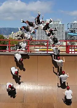 A sequence of still images has been stitched together to show the path taken by Takeshi Yasutoko doing an Alley-Oop Liu-Kang Flatspin 540