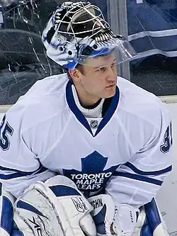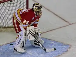 ![]() Toskala with the Calgary Flames in 2010 | |||