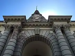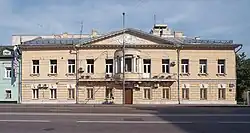 The first tangible building by Vesnin brothers, designed for Boris Velikovsky's firm, was a neoclassical six-storey apartment block on Myasnitskaya Square, completed in 1910.[14] One year earlier, Leonid obtained an architect's licence and the brothers went independent. Their first building, the City Post Office on the same Myasnitskaya Street, was based on an earlier draft by Oscar Muntz, was approved for construction in 1911 and completed in 1912.[14] The Vesnins retained the original planning and redesigned the facades in an eclectic Romanesque-Byzantine style.[14] Their father's death in 1910 and, perhaps, improved finances, prompted Alexander and Victor to return to classrooms and complete professional training.[15] Alexander graduated in May 1912.[15][16] Incidentally, Alexander's and Victor's graduation drafts of 1911-1912 are the only architectural drawings actually signed by each brother individually, and thus provide insight into each brother's own stylistic preferences that later blended under the ‘’Vesnin brothers’’ trademark.[17] Specifically, Alexander demonstrated proficiency in Russian Revival art but clearly mediocre, run-of-the-mill work in the neoclassical manner.[17] Nevertheless, in 1912–1913 the Vesnin firm established itself among the Neoclassical Revival movement, as evidenced by the 1913 Historical Exhibition where their drafts were displayed along with works by Ivan Fomin, Ivan Zholtovsky and other masters of the style.[18]