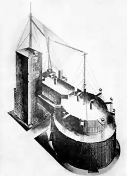 The Vesnins filed their draft, codenamed Antenna, in February 1923 along with 46 other entrants.[30][31] The rationalist arm of modernist architects led by Nikolai Ladovsky boycotted the competition, confident that the old-school commission led by Igor Grabar, Alexey Shchusev and Ivan Zholtovsky was biased against modernist art.[32] Neoclassicists also neglected the contest, confident that the project would never materialize.[33] The show attracted mostly constructivist architects[33] and became a sweeping victory for the Vesnin brothers: their 125 meter tall[34] reinforced concrete Palace, remotely reminiscent of Walter Gropius's Tribune Tower draft,[28] made headlines in the professional mainstream press. Reviews by Vladimir Mayakovsky and Moisei Ginzburg declared Vesnins’ draft the definitive statement of modernism.[32] Zholtovsky, did indeed reject the novelty and in the end, in May 1923, the first prize was awarded to Noi Trotsky;[32] the Vesnins came third.[35] For unknown reasons the highly publicized draft was omitted from the official competition catalogue; floorplans and cross-sections were published only in 1927,[36] along with Ginzburg's praise: "It cannot be imitated. It can only be followed, along the thorny path of independent, thoughtful and creative work."[37]