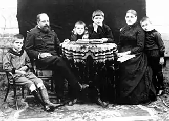 Three sons: Leonid (born 1880), Victor (born 1882) and Alexander (born 1883) received basic home schooling and demonstrated talent in drawing since early childhood. At the age of 10 – 12 years their father sent them to a boarding school at the Academy of Commerce in Moscow where they perfected their drawing skills in the class of M. V. Mamistov.[7]
