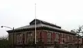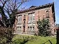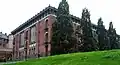 The building was designed by architect Hack Kampmann and was constructed between 1898 and 1902. It is prominently situated on a hill overlooking Aarhus River. The building is in National Romantic and historicist style, constructed from red bricks of lime and sandstone with a hip roof and a balcony.[6] It is adorned with many different types of frieze, bands and inscriptions. Above the front entrance is a relief showing a woman watering the Tree of Knowledge and along the eaves is a series of owls, symbolizing erudition and knowledge. The interior features designs by sculptor Karl Hansen Reistrup who also contributed to Aarhus Theatre.[7]