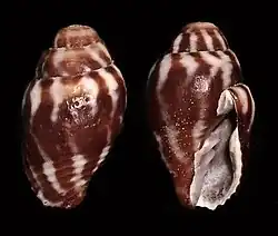 (Original description) The ovate shell is smooth. It is longitudinally ribbed, ribs obtuse. Its colour is ashy black. The ribs ornamented with a row of small white spots. The columella is four-plaited. [2]