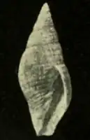 (Original description) The shell is narrowly biconic, rather thin. The protoconch consists of 3·½ smooth whorls, high, regularly coiled, bluntly pointed, and not distinctly marked off from brephic stage. The first whorl shows 3, following whorls with 4, subequal spirals, increasing, through grooving of main ribs, to 8 unequal ribs on penultimate whorl. The body whorl has about 24 unequal spirals, a few of which are grooved medially. The ribs are low and flattish, with much narrower interstices, finer and wider apart near beak. There is no axial sculpture. The punctures in the interstices seem also to be absent, but as both shells are slightly worn this cannot be determined for certain. The spire is acutely conical, lower than the aperture, the outlines are straight, very slightly scalar. The shell contains about 9 whorls, flat and regularly increasing. The body whorl is bluntly angled at its periphery, thence tapering quickly to the beak. The suture is straight, slightly oblique. Whorls worn in its neighbourhood so that it seems slightly subcanaliculate. It is also uncertain whether it is margined. The aperture is slightly oblique, long and narrow, slightly channelled above, with short open and truncated siphonal canal below. The outer lip is convex, acute, smooth within. The columella is subvertical, slightly twisted below, with 3 plaits in young shell, 4 in larger specimen; the plaits rapidly decrease in strength anteriorly, the last being very weak, they are truncated by the edge of the inner lip, which also stops the spiral sculpture. The fasciole is fairly distinct.[2]