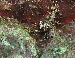 The shell is yellowish to chocolate-brown, with an interrupted or continuous white band composed of irregular spots. The tops of the longitudinal ribs are lighter in color, sometimes white.[2]