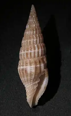 (Original description) The elongated shell is somewhat cylindrical and a little recurved at the base. The sutures of the spire are rather impressed. The shell is longitudinally closely ridged with beautiful shining riblets. The interstices transversely strongly latticed. The decussating cancellations are so regularly disposed, with the white stramineous and fuscous zoned spiral bands that they can serve to characterize the species. The shell is whitish, faintly spotted with pale brown. The lower portion of the body whorl is pale brown, whitish at the base. The columella is five-plaited. [2] [3]