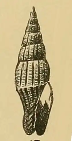 (Original description) The shell is lanceolate with a turreted spire. The whorls are longitudinally costoso-plicate. The narrow ribs are compressed. The interstices are conspicuously and deeply striate. The shell is ashy white, below bluish lead colour, the apex being tinged with the same colour. The columella is five-plaited. [2]