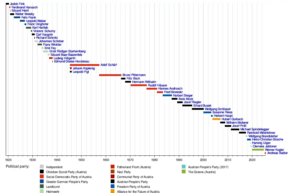 | 43 | Andreas Babler (born 1973) | 3 March 2025 | Incumbent | 170 days | SPÖ | Christian Stocker (ÖVP) |