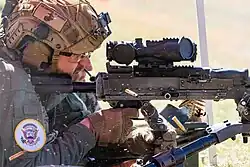 On March 26, Vance visited Marine Corps Base Quantico to commemorate the then-upcoming 250th anniversary of the founding of the U.S. Marine Corps.[99][100] At the event, Vance spoke to Marines about the history of the Marine Corps, saying: "Two-hundred-fifty years of winning wars, 250 years of kicking ass and taking names".[99][101] He also participated in shooting a M27 Infantry automatic rifle, M240 machine gun, M107 .50 caliber rifle, and M102 howitzer at the base firing range.[101] While visiting the base, Vance wore a helmet patch inscribed with "The Corporal of Marines" where the title "commander-in-chief" would appear on the U.S. president's patch.[100][101][102]