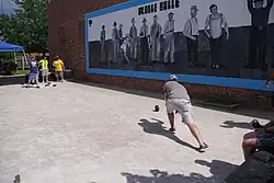 The Victor Rolle Bolle Mural overlooks Victor's outdoor courts. From 2014 to 2016, about a dozen HLV students used black and white paints to replicate four photos, which they combined into a single image. The completed mural was unveiled during Victor Fun Day, June 25, 2016, just before the start of the tournament.[20] From left to right, the people depicted in the mural are: Bill Stevens, Camiel Holevoet, Cyril Wauters, Julius DeBrower (bolling), Daisken Cornelius, Camiel DeGeeter, Camiel DeHooge, Alfonse Van Gampleare, Daisken Cornelius, John Claeys, Henry Ahrens, and Bob DeWitte.