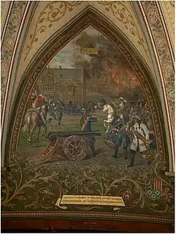 Lagye was able to obtain various public commissions for monumental decorations in churches and public buildings. He also lobbied the Belgian government for funds for these projects. He worked around 1850 with Jean-François Portaels on 20 murals in the chapel of the Brothers of the Christian Doctrine in Brussels. The artists used a new process, which is referred to as 'water-glass painting'.[9] Water-glass painting is a technique of mural painting, intended to resist the effects of damp and pollution, that was invented and popular in the 19th century. It is a form of fresco painting.[10] In 1855 he collaborated with Lucas Victor Schaefels on the decorations in the St Anthony Church in Antwerp. The artists again used the water-glass painting process.[11] Lagye also worked in 1859 on decorations in Gaasbeek Castle depicting various episodes from Belgian history such as The burning of Gaasbeek by the French.