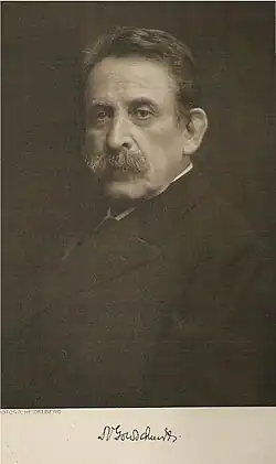 Born 1853 in Mainz, Goldschmidt was the son of the merchant Salomon Benedikt from the wealthy Goldschmidt family and Josephine Edle von Portheim who came from a wealthy family in Prague. The family wanted him to work in metallurgy and he attended the Bergakademie Freiberg in Saxony where he was influenced by Albin Weisbach. He graduated in metallurgical engineering in 1874. He received his doctorate in 1880 under Heinrich Rosenbusch in Heidelberg for his work on mechanical rock analysis and continued his studies in Vienna from 1882 to 1887. He worked with Aristides Brezina and Heinrich von Foullon. In 1888, he wrote his habilitation about "Projektion und graphische Krystallberechnung" (Projection and graphical Crystal Classification) under the same supervisor as his doctoral dissertation. He married Leontine Porges von Portheim, the daughter of his mother's brother the textile manufacturer Eduard Porges, in 1888. He converted to Christianity as his wife was Catholic. He founded the Institut für Mineralogie und Kristallographie in Heidelberg in association with the Josefine and Eduard von Portheim Stiftung, named in memory of his maternal ancestors. He and his wife travelled around the world collecting art and ethnographic objects. The made their collections public in the Palais Weimar in Heidelberg that they purchased. In 1893, he became an adjunct professor (Honorarprofessor) at the University of Heidelberg and in 1909 he was made a full honorary professor. In 1913, he was awarded membership in the Heidelberger Akademie der Wissenschaften (Heidelberg Academy of Sciences).[1] During his time on the faculty at Heidelberg, one of his famous students was the American volcanologist Thomas Jaggar.
