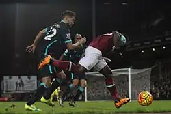 On 1 September 2015, Moses joined West Ham United on a season-long loan.[53] Before joining West Ham United on loan, Moses signed a new four-year contract, which will keep him at Chelsea until 2019.[54] Moses made his West Ham debut on 14 September in a 2–0 home win against Newcastle United, where he was named Man of the Match.[55] In his second game, on 19 September away against Manchester City, Moses scored his only West Ham goal, in a 1–2 win.[56] On 5 December, during the match against Manchester United, Moses suffered a hamstring injury that ruled him out until February.[57]