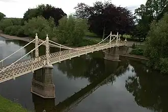 Victoria Bridge, Hereford is a foot-bridge in Hereford, opened in 1898 to commemorate the 1897 Diamond Jubilee of Queen Victoria.[1] It is located on Mill Street and crosses the River Wye. The suspension bridge features iron lacework and was built to replace an earlier ferry across the river. It is classified as a Grade II bridge which the United Kingdom states deserves "every effort to preserve them."[2] Its history is highlighted at the Hereford Library and Museum.