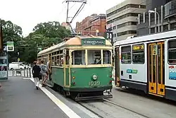 Victoria Street is serviced extensively by public transport, with St Vincent's Plaza acting as an interchange stop for most tram and bus routes that run along the street.[14] Several tram routes run along portions of Victoria Street and Victoria Parade's length, including the 11, 12, 30, 57 and 109.[15]