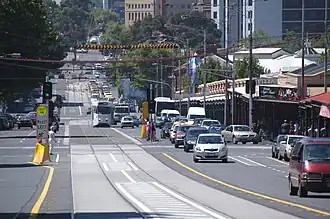 Victoria Street is one of the major thoroughfares of inner Melbourne,[2][3] running east–west for over six kilometres between Munster Terrace in North Melbourne and the Yarra River. The road is known as Victoria Parade for over one-and-a-half kilometres of its length (between the prominent intersections of Spring Street and Hoddle Street), distinguishable with a wide reservation and tramway down the middle.[4]