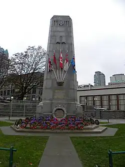 On the northern side of the square, on a plaza flanking Hastings Street, lies the Vancouver war memorial, the Victory Square Cenotaph. The cenotaph is approximately 30 feet (9.1 m) tall, and is a triangular edifice whose shape conforms to that of the square. The pillar is of Nelson Island granite engraved with suitable inscriptions, and is kept continuously banked high with wreaths of flowers and adorned with national flags.