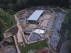 In the village center an area of about 2,500 square metres (27,000 sq ft) has been excavated. The developed area stretched along the road, which was paralleled by drainage ditches and an arcade. So far three building complexes with different construction phases can be distinguished.