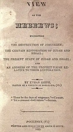 View of the Hebrews is an 1823 book[1] written by Ethan Smith, a Congregationalist minister in Vermont, who argued that Native Americans were descended from the Ten Lost Tribes of Israel, a relatively common view during the early nineteenth century.[2] Numerous commentators on Mormon history, from LDS Church general authority B. H. Roberts to Fawn M. Brodie, biographer of Joseph Smith, have noted similarities in the content of View of the Hebrews and the Book of Mormon, which was first published in 1830, seven years after Ethan Smith's book.