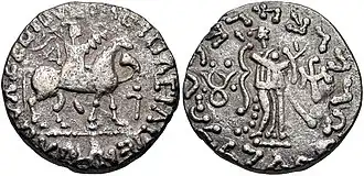 ![]() Vijayamitra riding in armour, holding a whip. Like many other Indo-Scythians, Vijayamitra did not issue portraits. | |