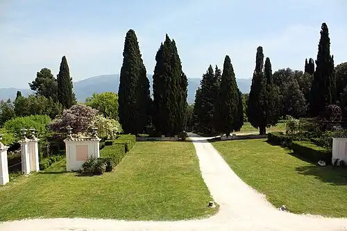 Giuseppe Valadier also designed a large park around the Villa. Across from the entrance surrounded by oaks, is a 2000 m2 park where cypress trees lead to the peak of the hill with two lateral paths that guide the way along the property. The central axis continues through a geometric square that contains two large pavilions made of wrought iron and decorated with roses ending in an elliptical square limited by exedras. The layout is in the geometric and symmetric lines of traditional Italian gardens, while the park as a whole follows the contour of the land in the style of English naturalism with hundreds of box hedges that create shaded winding walkways called ‘Cocchi’, bounded by pergolas and flowers.[2]