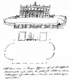 In the past, there were two buildings symmetrical to the access axis. The park, also designed by Valadier, is distinguished by various architectural elements. The Secret Garden, a large elliptic esplanade in front of the facade, is encircled by a two-wall portico that opens to two opposite, open-sided galleries with panoramic views and two vast symmetrical Gazebos (pavilions) in wrought iron decorated with roses. The geometric and symmetric character of the layout adheres to traditional Italian gardens, combining decorative elements, comfort, and nature. All architectural elements of style, character, and complementary functions, give the structure unity and artistic value.[2]