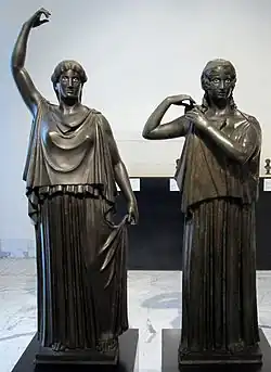 Five statues of life-sized bronze dancing women wearing the Doric peplos sculpted in different positions and with inlaid eyes are adapted Roman copies of originals from the fifth century BC. They are also hydrophorai drawing water from a fountain.