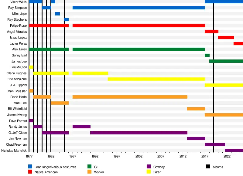 ![]() Village People in 1978 From left: Randy Jones, Glenn Hughes, Felipe Rose, Victor Willis, David Hodo, Alex Briley | |